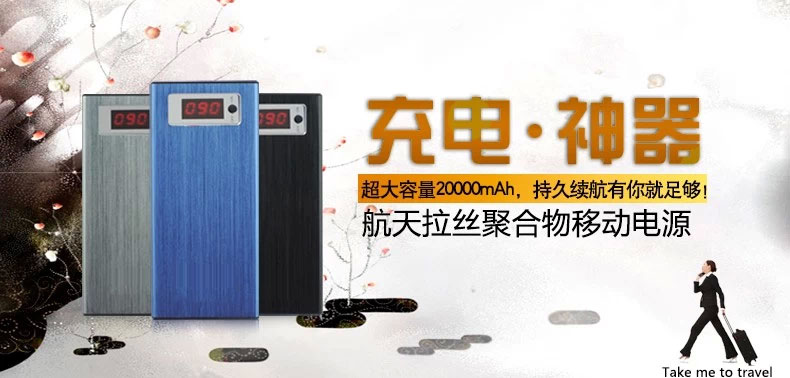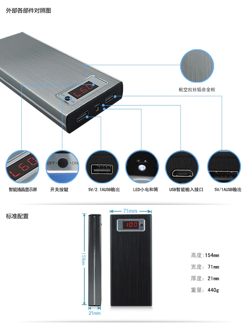 with LED Bar Indicator Power Bank : 20000 mAh capacityCompact design with large capacityLED indicatorsSecurity protection designShort-circuit and over current protectionPerfect for long plane flights, road trips; charge your devices any time any where,With connectors compatible with almost all the digital devices such as smart phones, cell phones, tablets, cameras, MP4s, navigation and etc