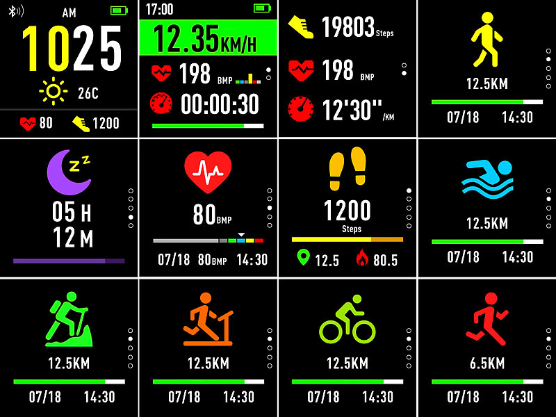 Fitness functions: heart rate, steps, distance covered, calories burned, sleep monitoring, activity alarm