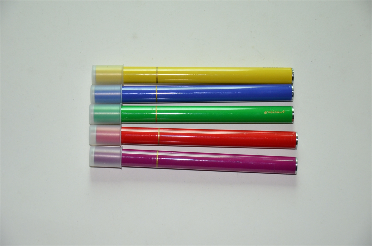 the e-cigs is disposable with 5 color paintingevery 5 piece load into a packs, every 10packs into a display. 400 puffs with 280mA battery,108mm length, 9.2mm diameter 5 different flavor can be choosed, Blueberry, Strawberry, Apple, AGrape, Peach