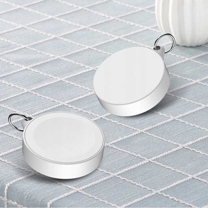 Magnetic charger of white color, portable, keychain for APPLE WATCH devices.