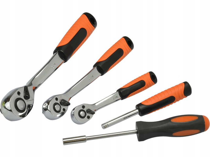 The set includes 1/2 ", 3/8" and 1/4 "ratchets (durable ratchet mechanism - 72 teeth) with bent, ergonomic handles, as well as a rich package of hexagonal sockets with two lengths, with embossed inscriptions (in sizes from 4 to 32 mm), Torx sockets (E4 - E24) and screwdriver bits (flat, cross, hexagonal, Torx).