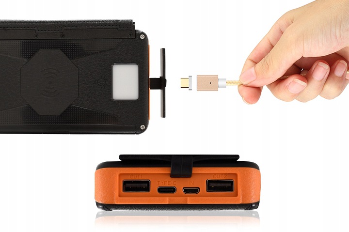 Thanks to the built-in handle (eyelet), you can attach the expanded powerbank to the backpack and charge it during e.g. hiking.