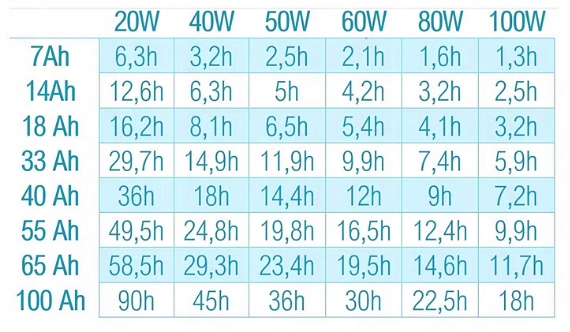 The table opposite presents the time needed to charge the batteries available on the market depending on the power of the photovoltaic system.